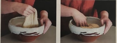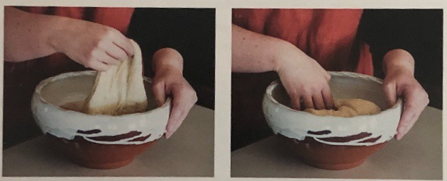 Grab the dough with one hand and stretch then fold it over itself. Go around the bowl once (6-8 motions) Don’t be tempted to keep going to ‘even it out’. Rest for 30 minutes.